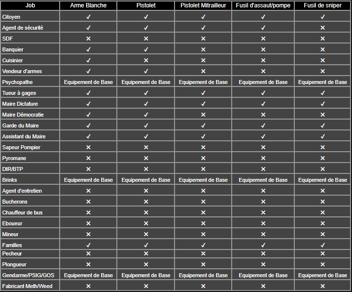 - Tous les métiers non mentionnés dans le règlement sont autorisés à effectuer toutes les actions, à l’exception des actions illégales.